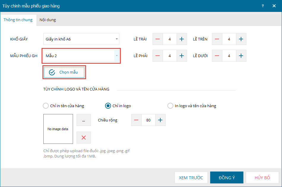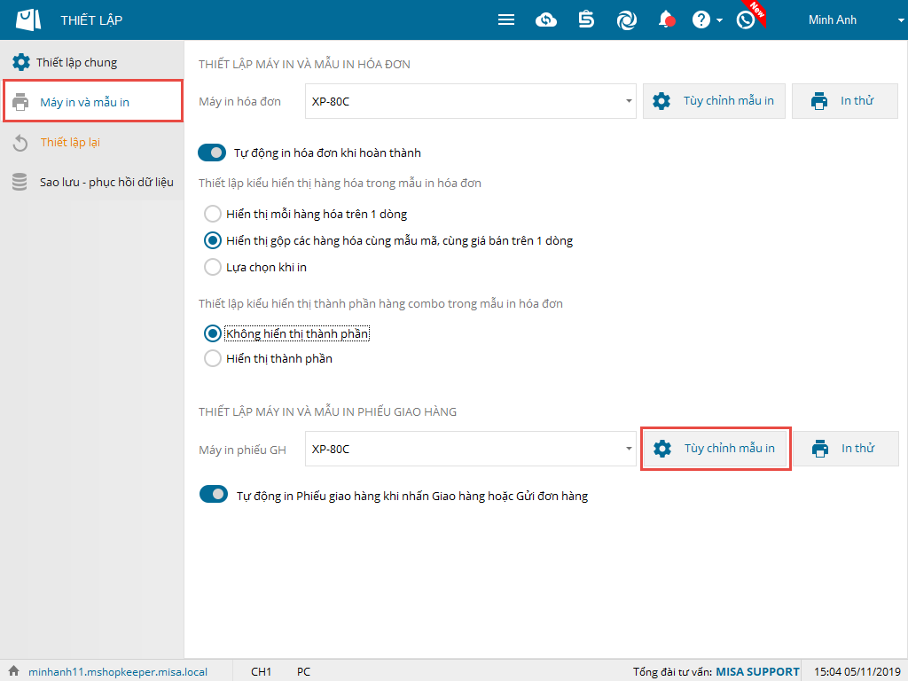 Bước 1: Truy cập màn hình Thiết lập, máy in và mẫu in, ở phần Thiết lập máy in và mẫu in phiếu giao hàng, nhấn tùy chọn mẫu in