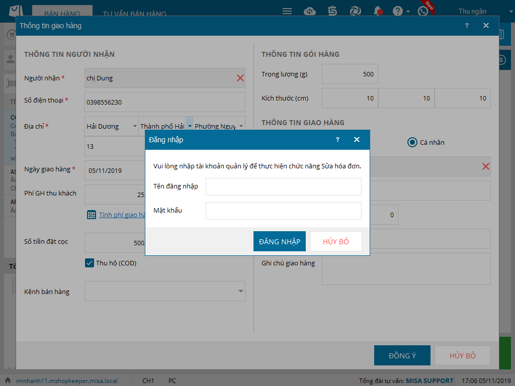 - Khi thu ngân sửa đặt cọc của hóa đơn chờ giao hàng, phần mềm sẽ yêu cầu quản lý cửa hàng đăng nhập để xác nhận sửa đặt cọc.