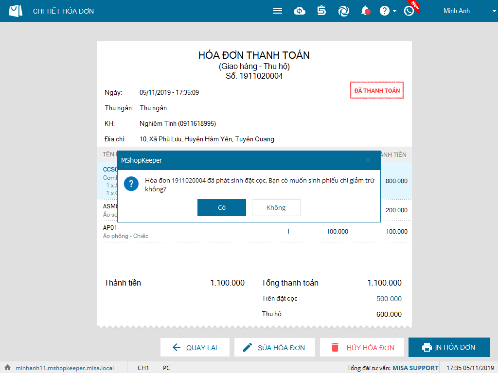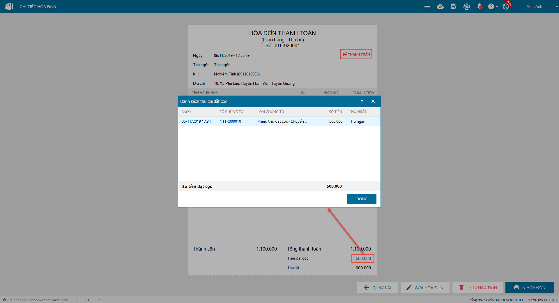 - Đối với hóa đơn trong ca làm việc, chương trình sẽ cập nhật lại số tiền đặt cọc của phiếu thu trên web.