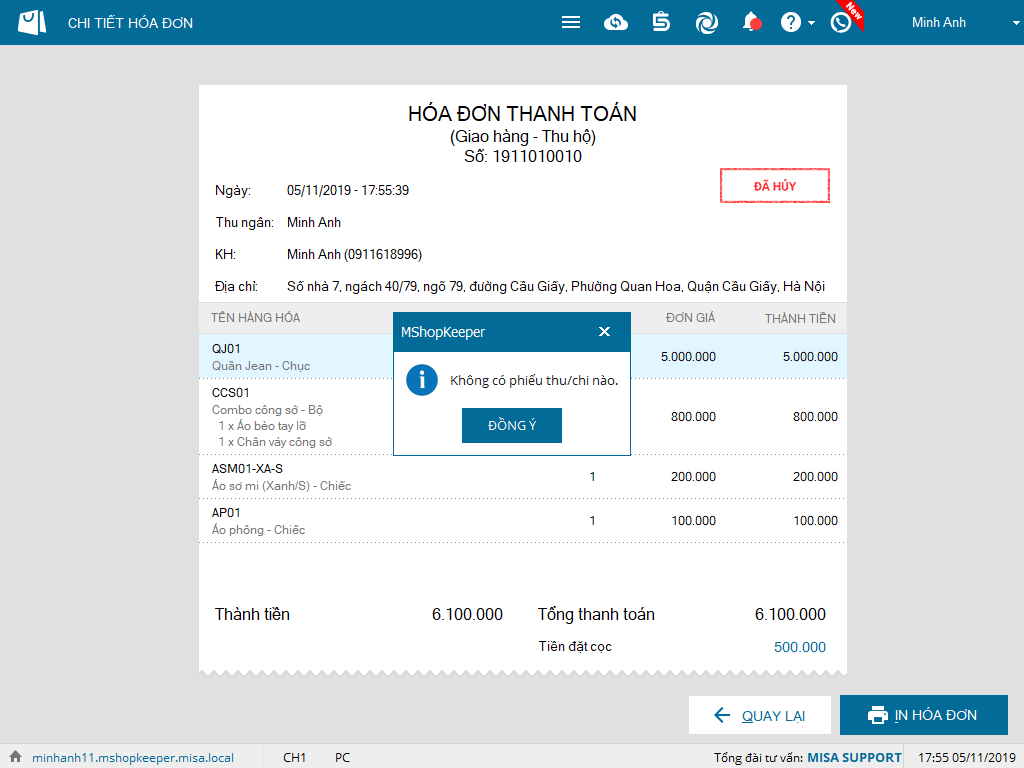 - Thu ngân thực hiện hủy hóa đơn giao hàng có đặt cọc trong ca làm việc, chương trình sẽ hỗ trợ thu ngân xử lý xóa phiếu thu trên web nếu muốn.