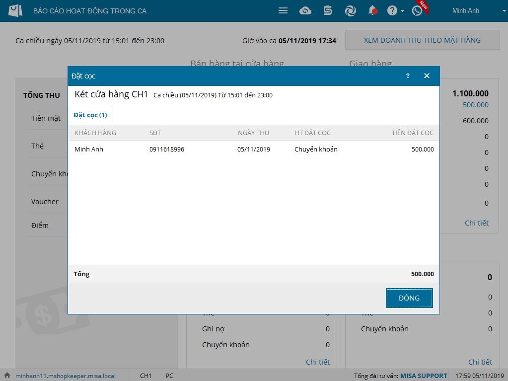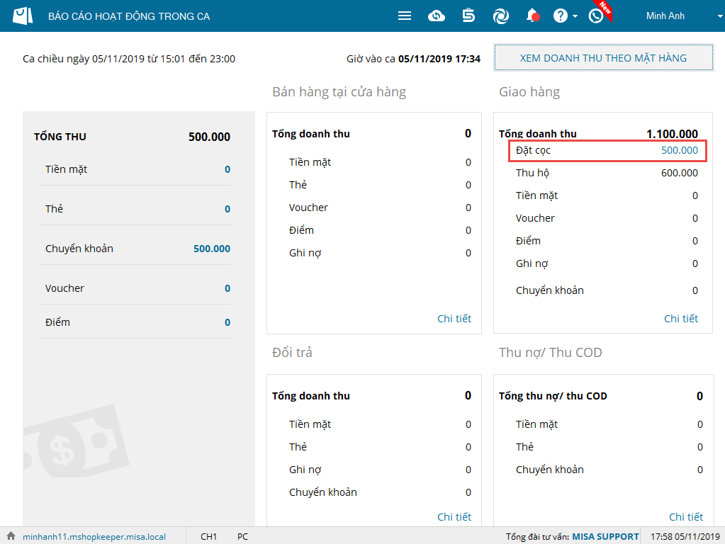 - Trên báo cáo hoạt động trong ca, phần mềm bổ sung thông tin đặt cọc trong ca làm việc ở phần Tổng doanh thu