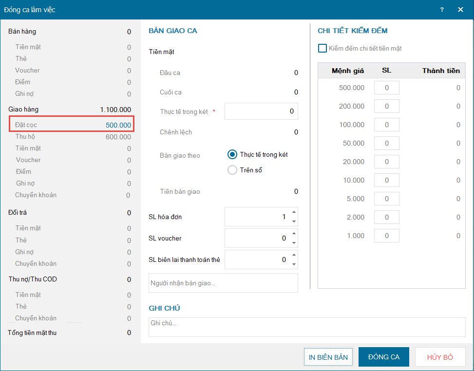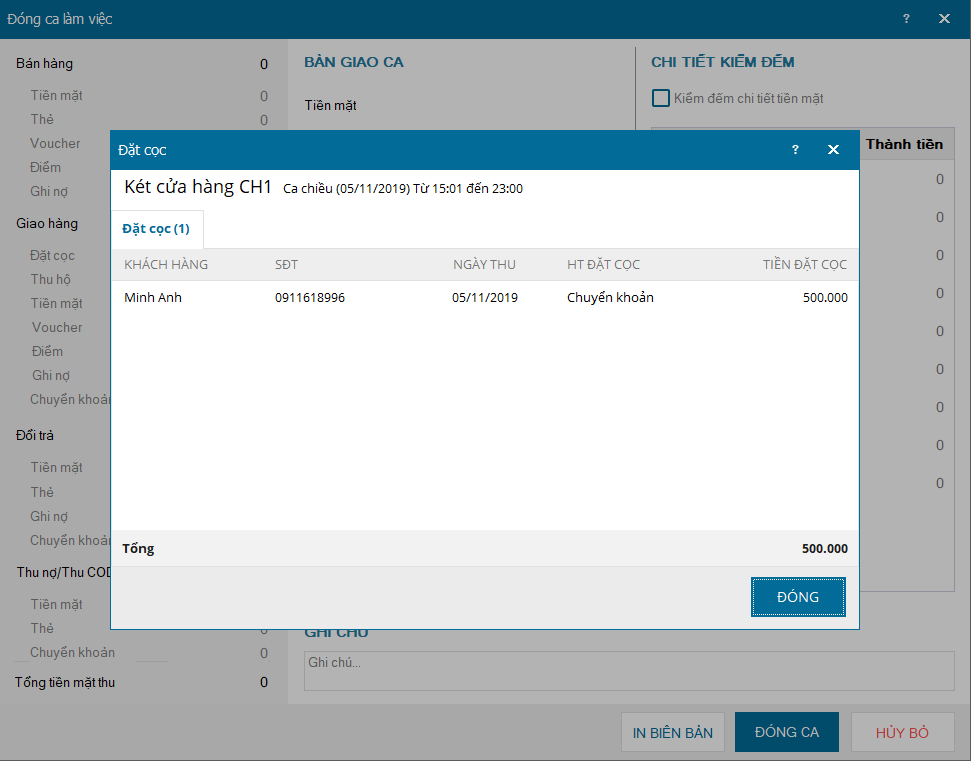 - Trên màn hình đóng ca làm việc, phần mềm bổ sung thông tin đặt cọc trong ca làm việc ở phần giao hàng