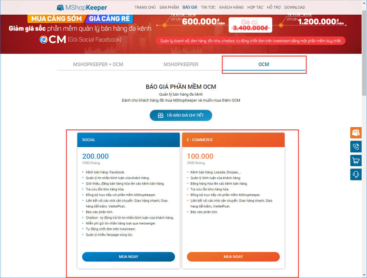 Bước 2: Chọn tab OCM, sau đó chọn gói OCM mà cửa hàng muốn mua
