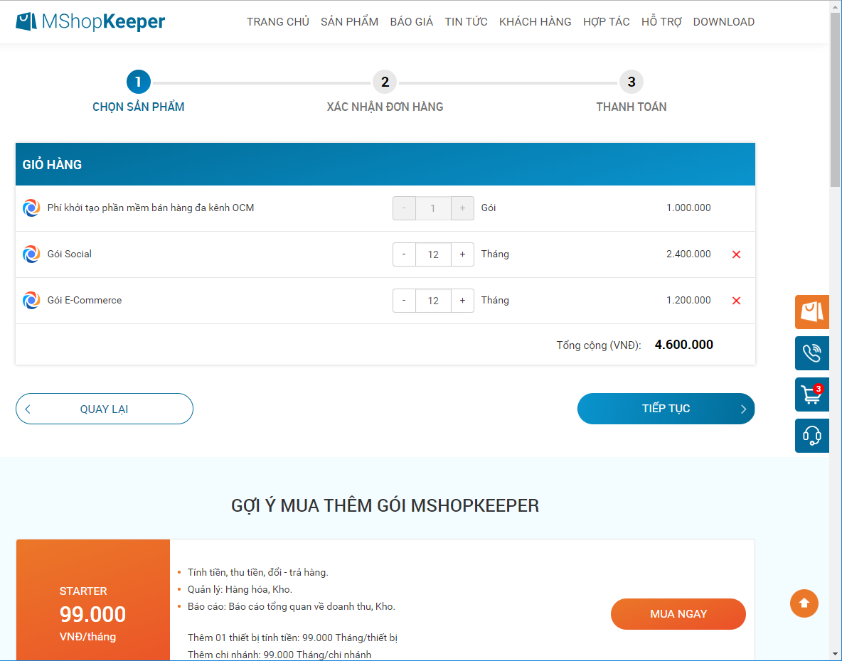 Bước 3: Sau khi chọn xong gói sản phẩm cửa hàng muốn mua, nhấn tiếp tục để thực hiện xác nhận đơn hàng.