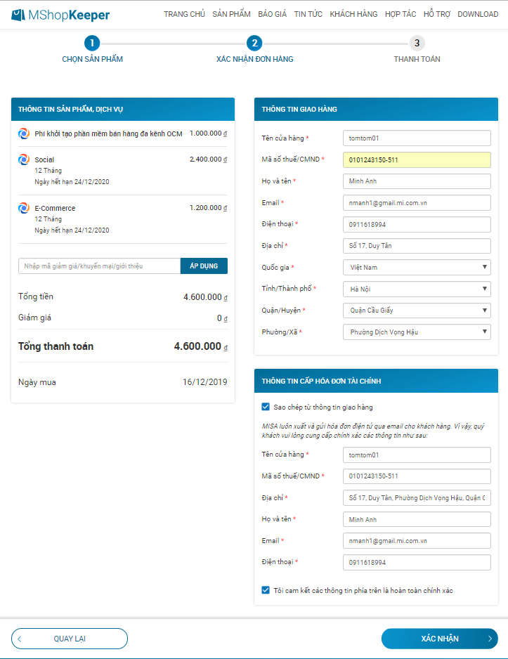 Tại màn hình xác nhận đơn hàng, quản lý cửa hàng nhập mã giảm giá (nếu có), thông tin giao hàng, thông tin cấp hóa đơn tài chính và tích chọn “Tôi cam kết các thông tin phía trên là hoàn toàn chính xác”.