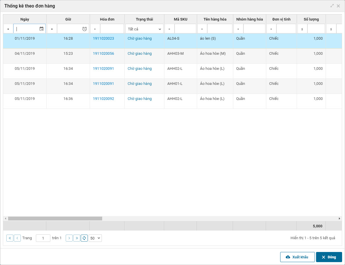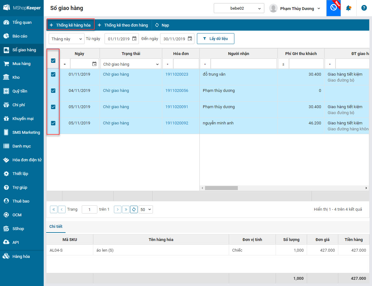 Bước 1: Chọn đơn hàng và nhấn Thống kê hàng hóa