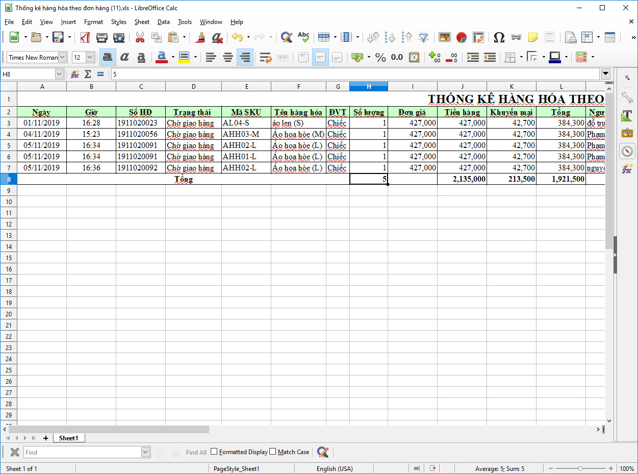 Cách 1: thống kê hàng hóa theo đơn hàng