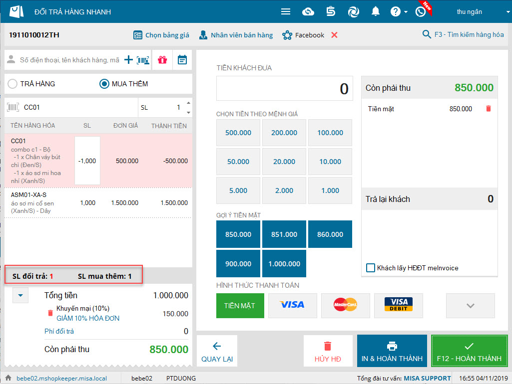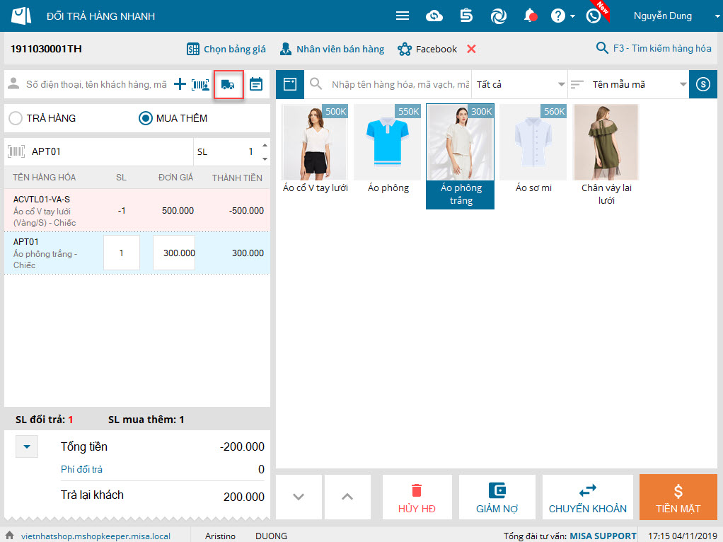 Bước 1: Thu ngân chọn thêm hàng đổi hoặc mua thêm của khách