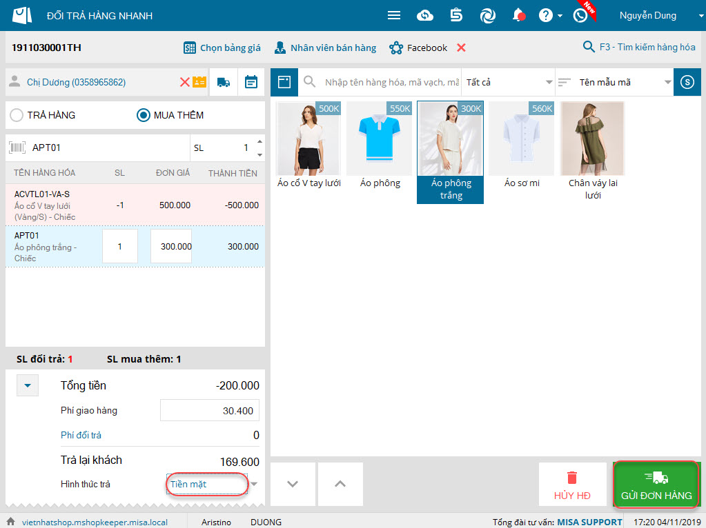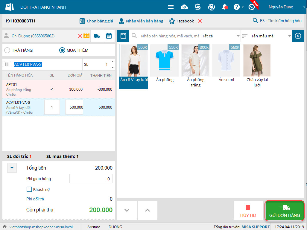 - Trường hợp hàng mua thêm có giá trị lớn hơn hàng trả lại. Chọn Khách nợ (nếu có), rồi thực hiện nhấn Gửi đơn hàng.