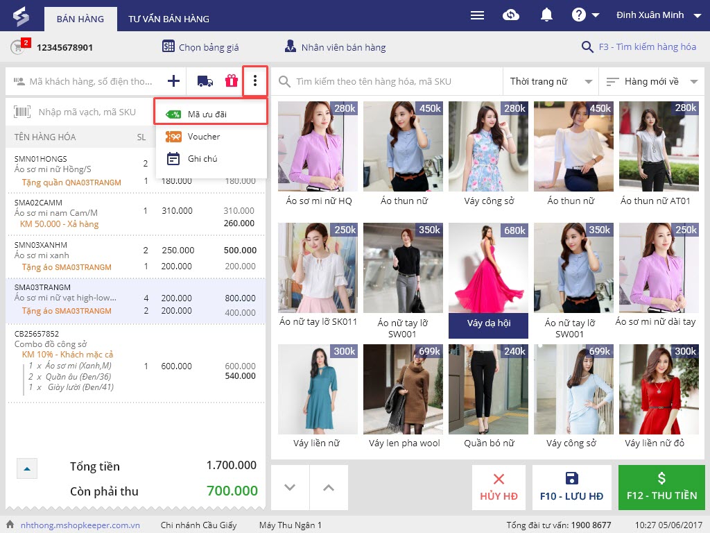 Sau khi quản lý thiết lập mã ưu đãi, trên trang bán hàng, thu ngân thực hiện tạo đơn cho khách.
