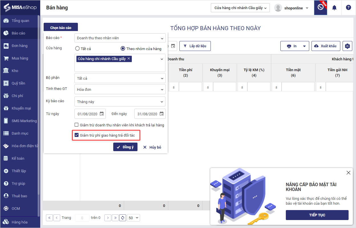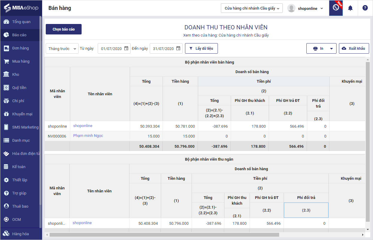 1. Trên báo cáo doanh thu theo nhân viên, khi tính doanh thu cho từng nhân viên phần mềm sẽ trừ đi phần phí phải trả cho đối tác giao hàng.