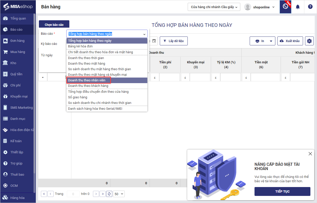 Bước 1: Trên trang quản lý, chọn Báo cáo\ Bán hàng\ Báo cáo doanh thu theo nhân viên.