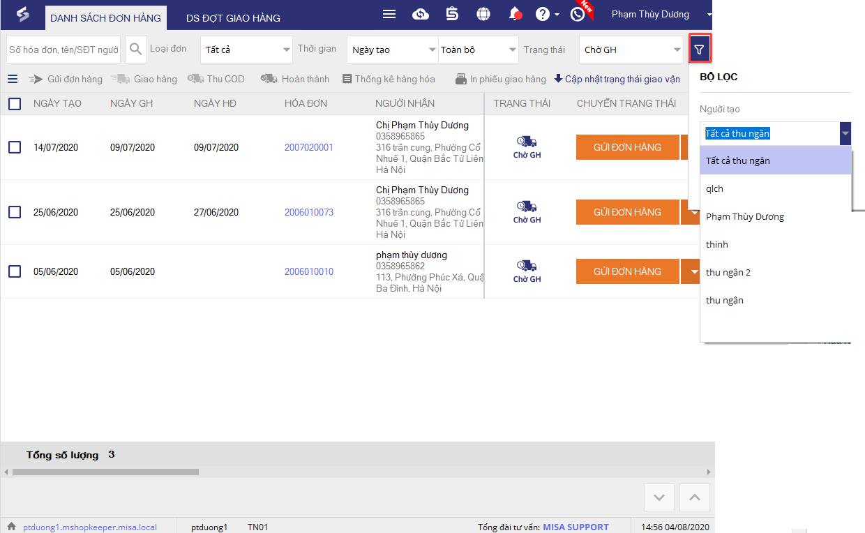 Lưu ý: Phần mềm mặc định hiển thị danh sách đơn hàng của Tất cả thu ngân.