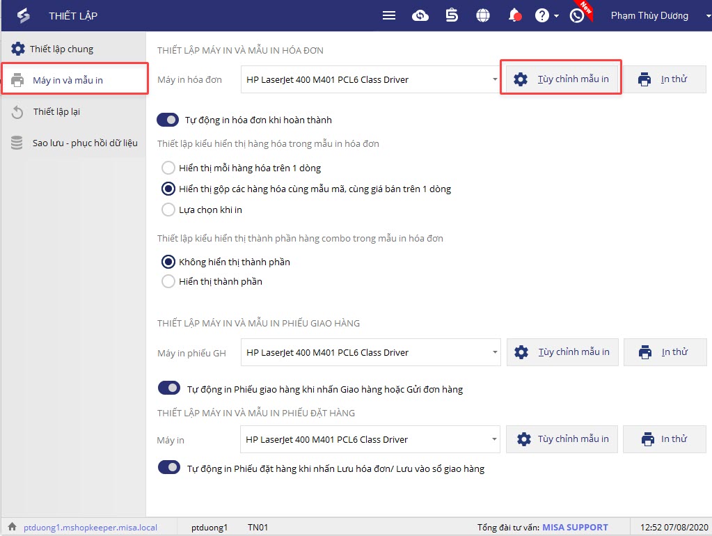 Bước 2: Chọn Máy in và mẫu in\ Tùy chỉnh mẫu in.