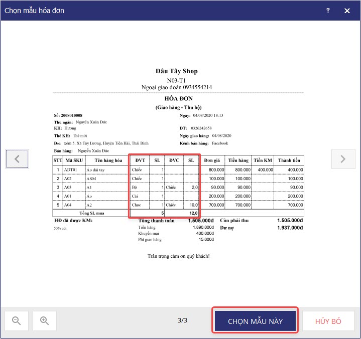 Bước 5: Chọn mẫu in mới có hiển thị ĐVT và ĐVC. Nhấn Chọn mẫu này.