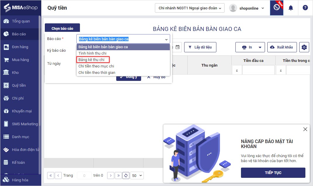 Bước 2: Chọn báo cáo Bảng kê thu chi.