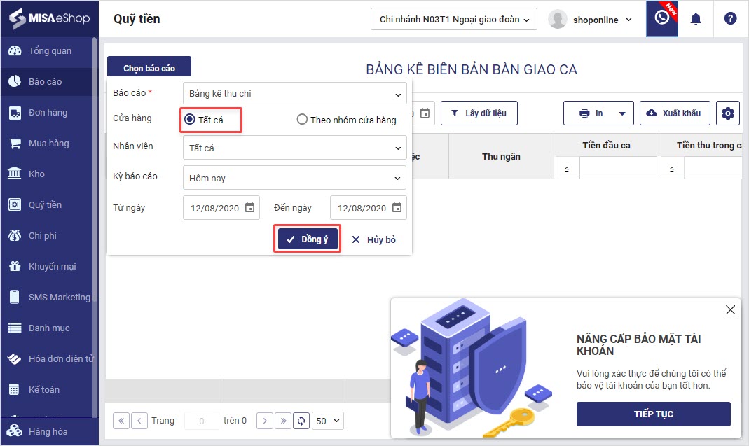 Bước 3: Để xem báo cáo của tất cả các chi nhánh, ở mục Cửa hàng, chọn Tất cả.