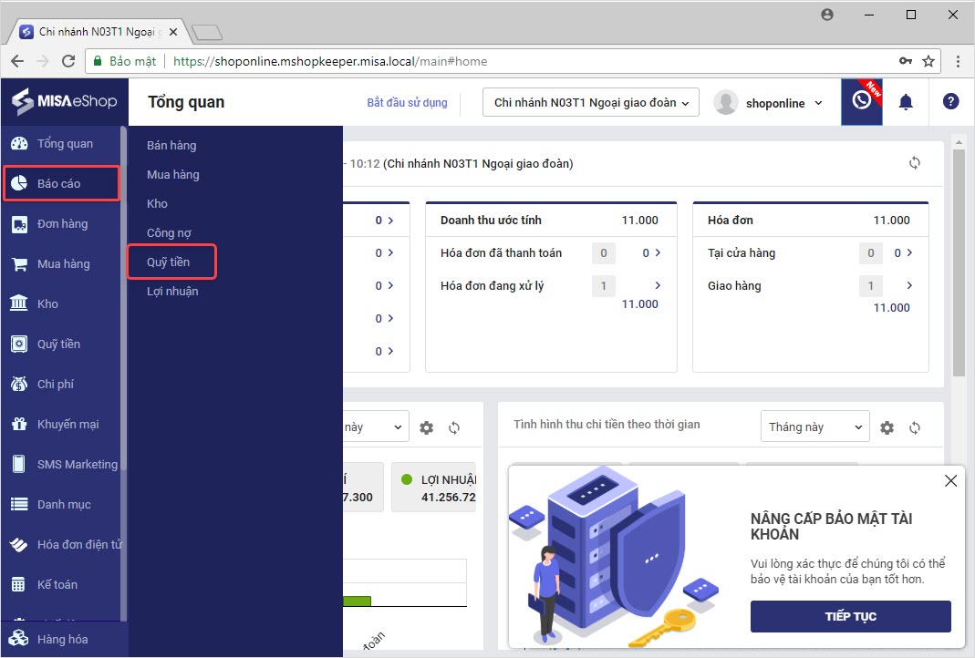 Bước 1: Trên trang quản lý\, chọn Báo cáo\ Qũy tiền.