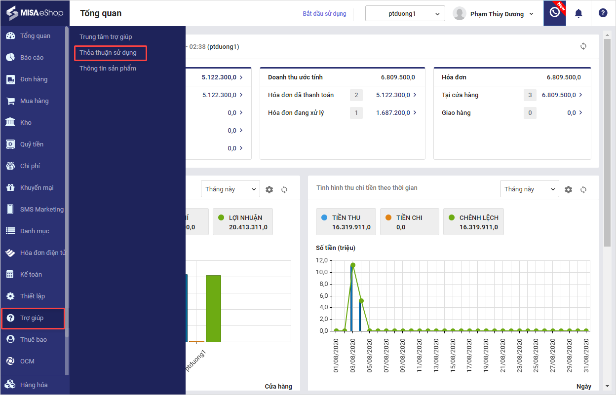 Bước 2: Sau khi xác nhận, người dùng nhấn Trợ giúp\ Thỏa thuận sử dụng để xem thông tin.