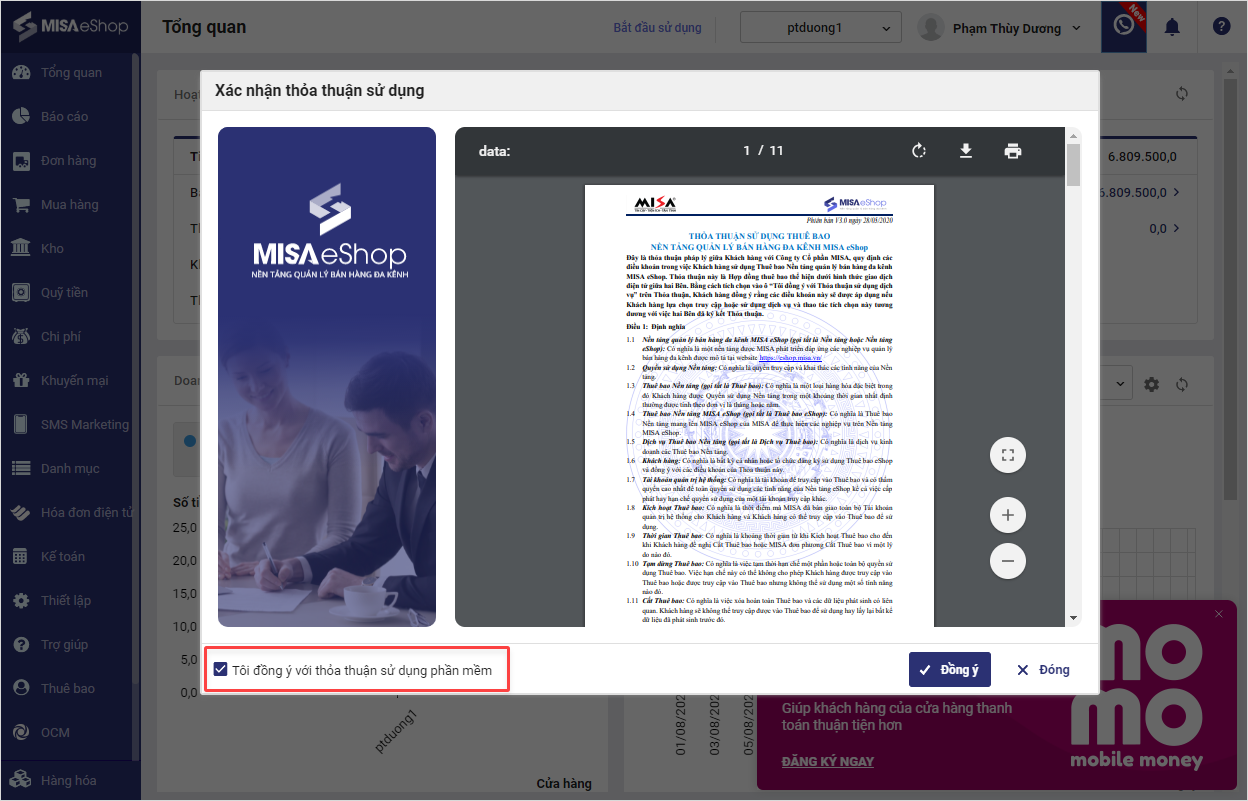 Bước 1: Khi đăng nhập vào trang quản lý, chương trình hiển thị nội dung thỏa thuận sử dụng dịch vụ, quản lý tích chọn vào ô Tôi đồng ý với thỏa thuận sử dụng phần mềm.