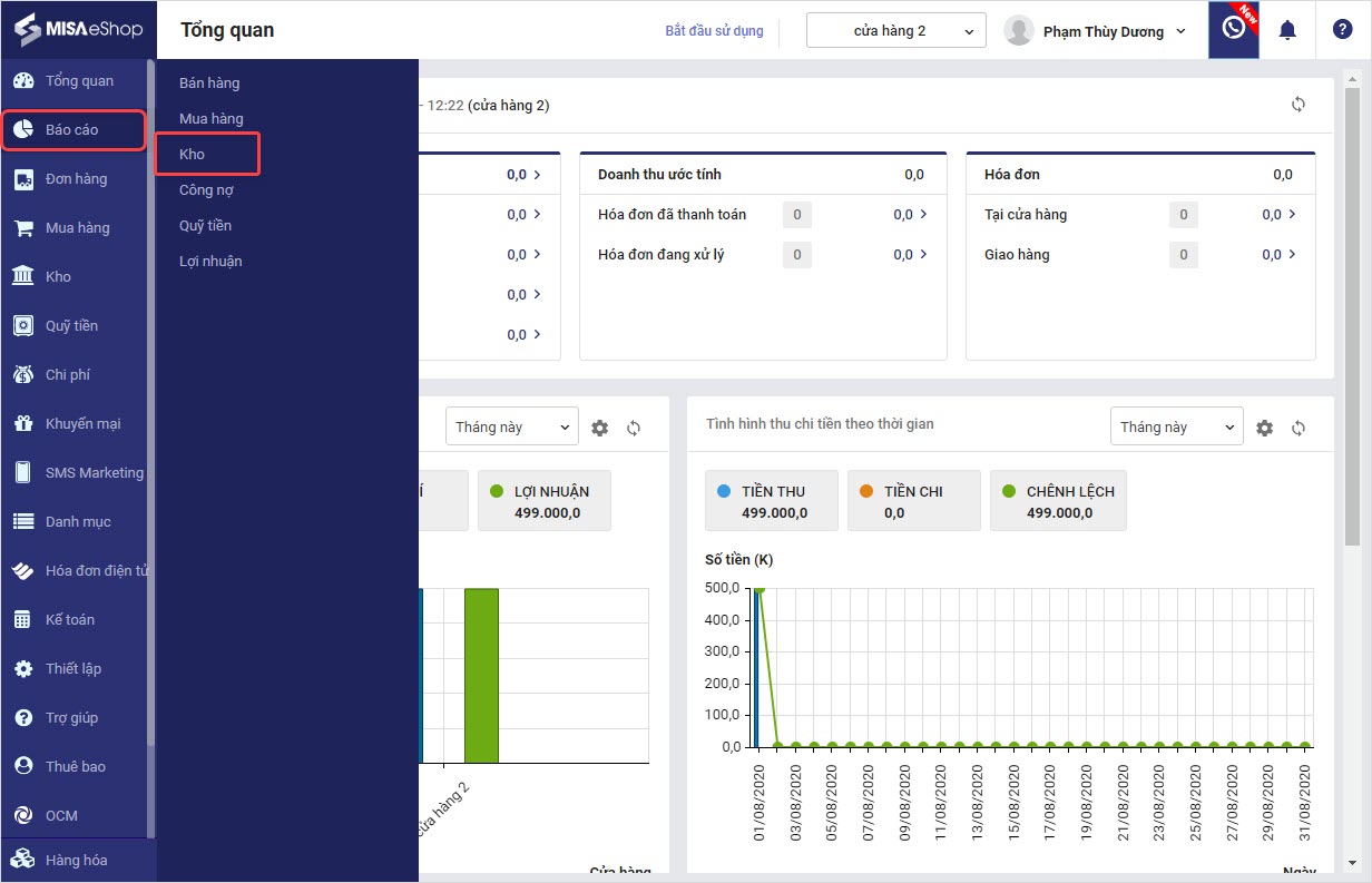 Bước 1: Trên trang quản lý, chọn Báo cáo\ Kho.