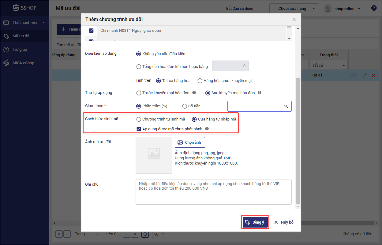- Chương trình cho phép áp dụng mã ưu đãi trên 5Shop do cửa hàng tự nhập khẩu và tính giá khuyến mại đã tạo trên trang quản lý.