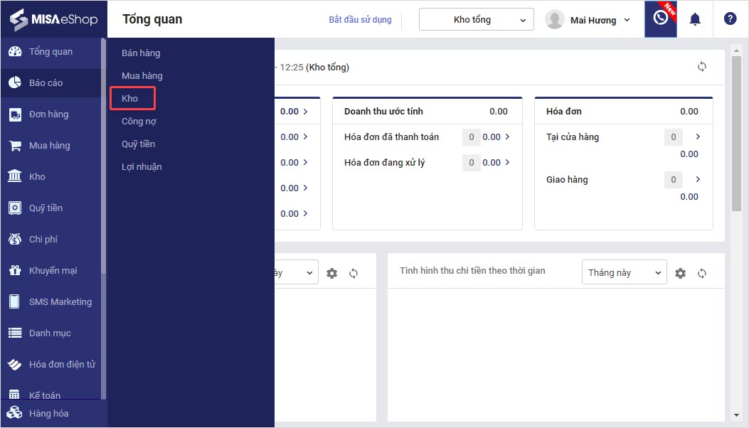 Bước 1: Trên trang quản lý, chọn Báo cáo\ Kho.