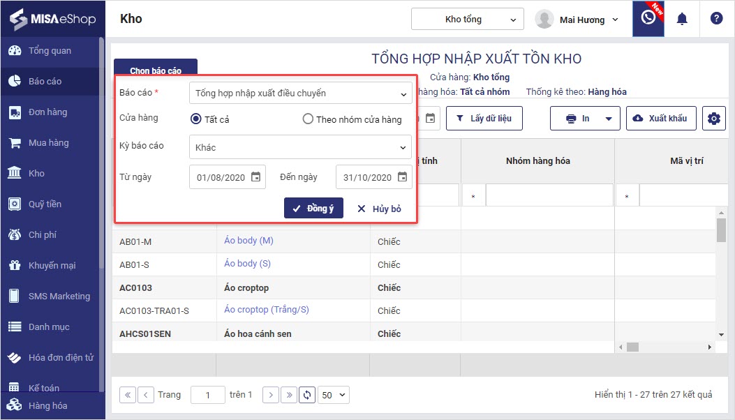 1. Quản lý cửa hàng có thể xem báo cáo Tổng hợp nhập xuất điều chuyển theo toàn chuỗi.