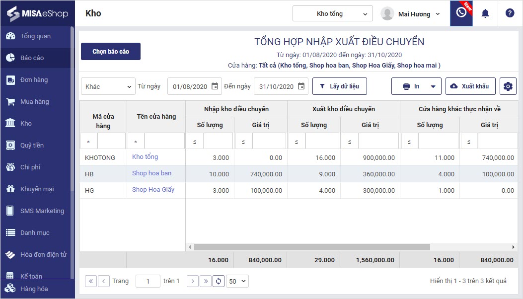 - Quản lý cửa hàng có thể xem báo cáo Tổng hợp nhập xuất điều chuyển theo toàn chuỗi.
