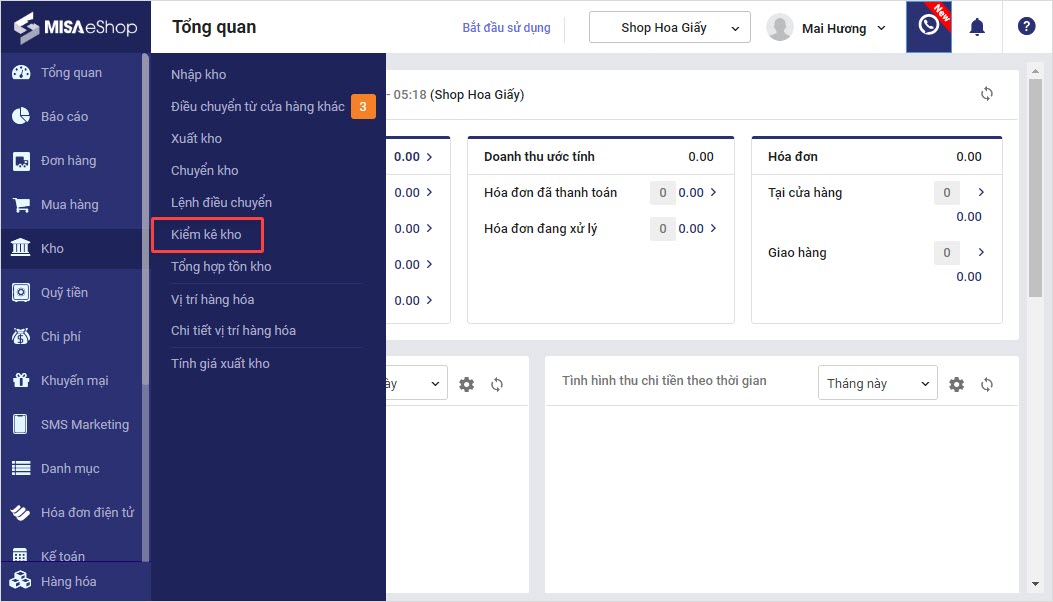 Bước 1: Trên Trang quản lý, chọn Kho\ Kiểm kê kho.