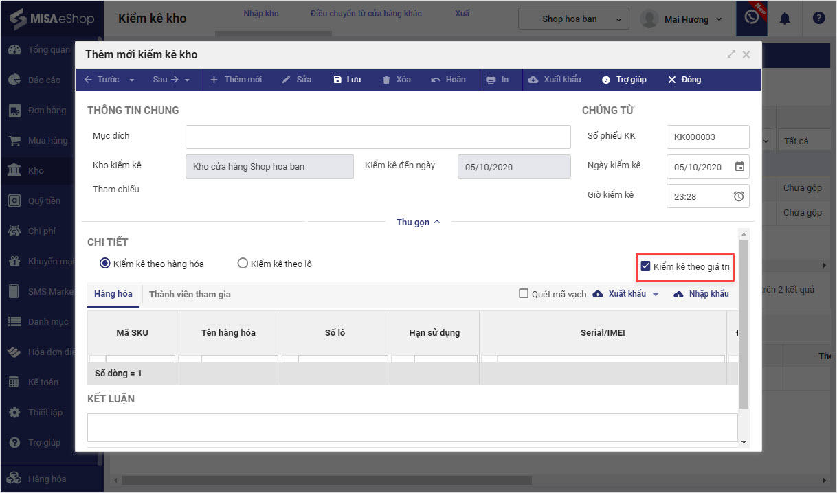 Bước 2: Nhấn Thêm mới\ Tích chọn Kiểm kê theo giá trị.