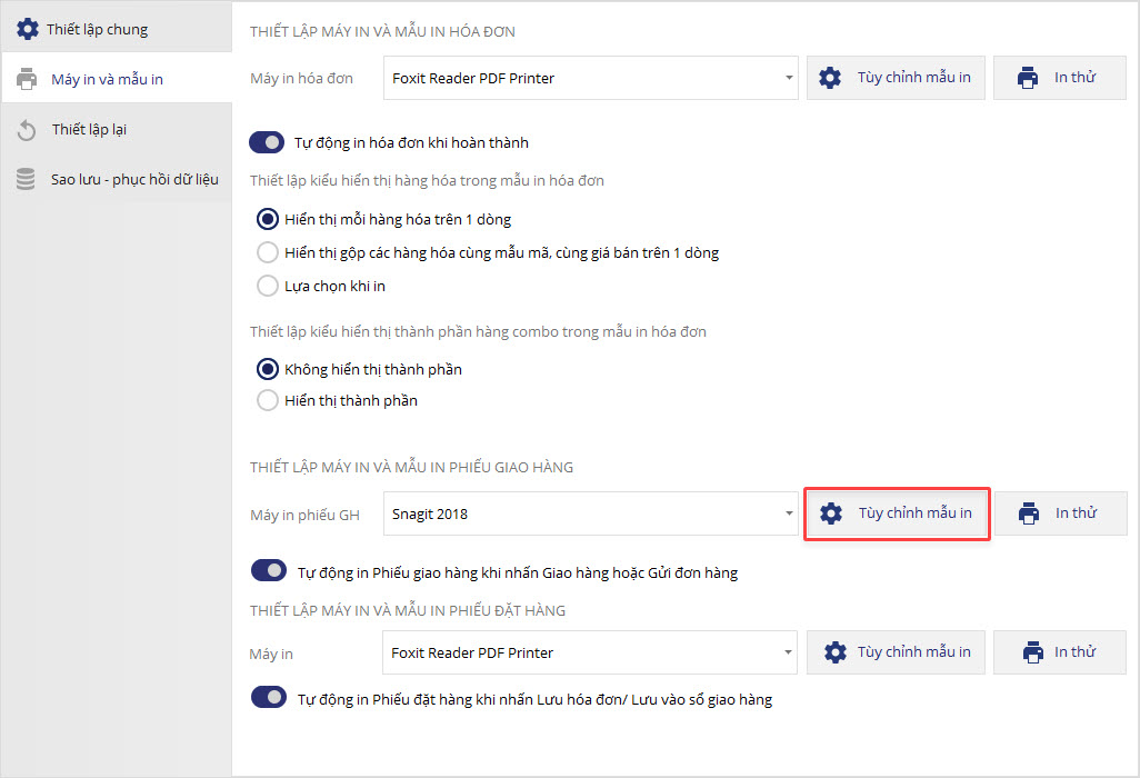 Bước 2: Tại mục Thiết lập mẫu in và máy in phiếu giao hàng, chọn Tùy chỉnh mẫu in.