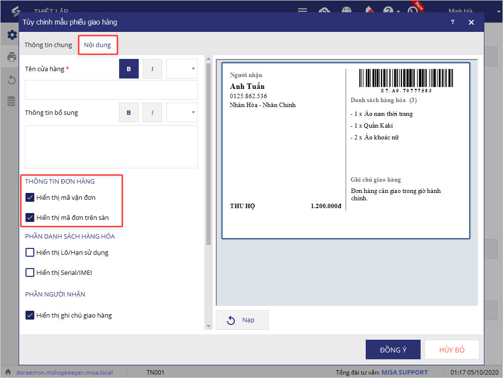 3. Trên phiếu GH khổ A5, bổ sung hiển thị thông tin Mã vạch vận đơn, mã đơn trên sàn.