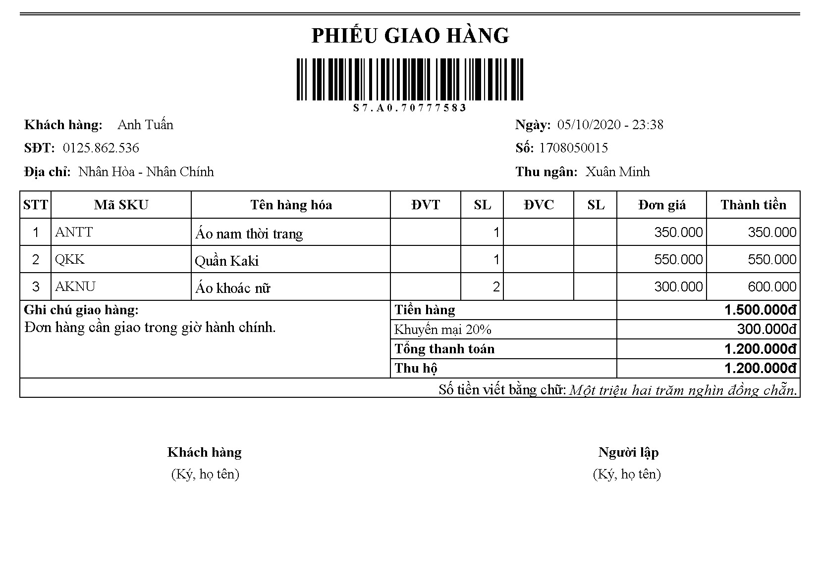 Sau khi thiết lập hiển thị mã vận đơn, phiếu giao hàng sẽ hiển thị như sau: