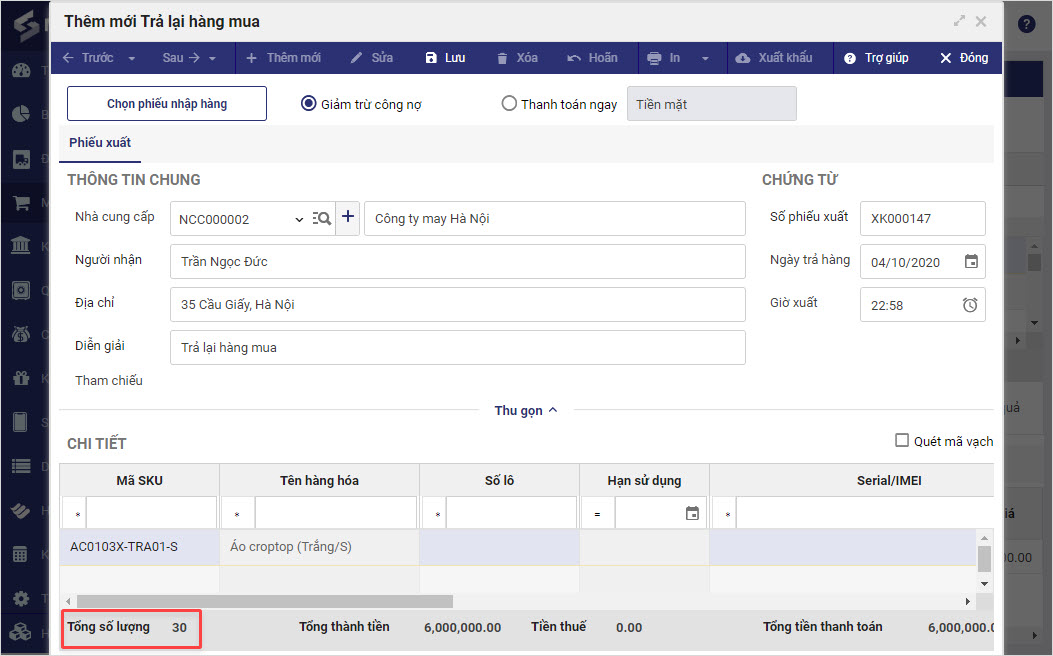 - Trên phiếu Trả lại hàng mua, bổ sung Tổng SL hàng hóa giúp QLCH/Kế toán có thể đối chiếu với SL trả lại thực tế.