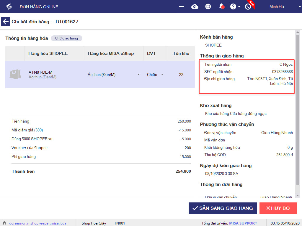 Khi đồng bộ đơn hàng từ sàn về MISA eShop, phần mềm tự động kiểm tra số điện thoại người nhận trên đơn hàng: