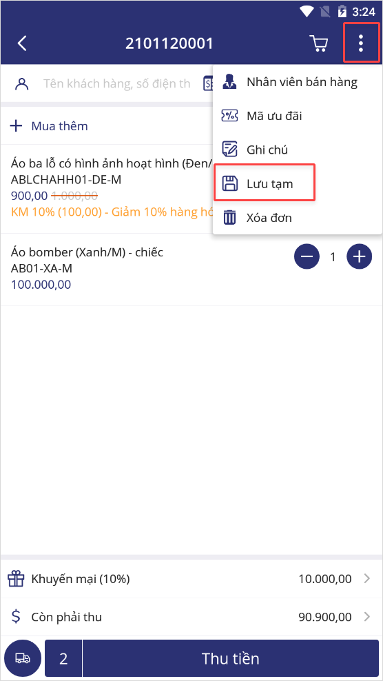 3. Bổ sung chức năng Lưu tạm cho đơn tại cửa hàng.