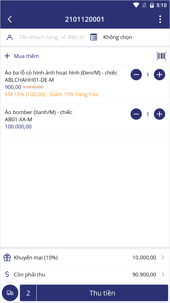 Sau đó, nhấn Thu tiền.