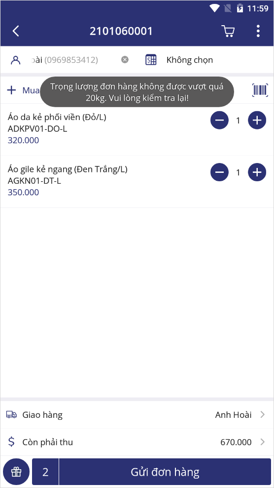 Khi trọng lượng hàng hóa quá quy định của đối tác vận chuyển, chương trình sẽ hiển thị cảnh báo như ảnh dưới đây.