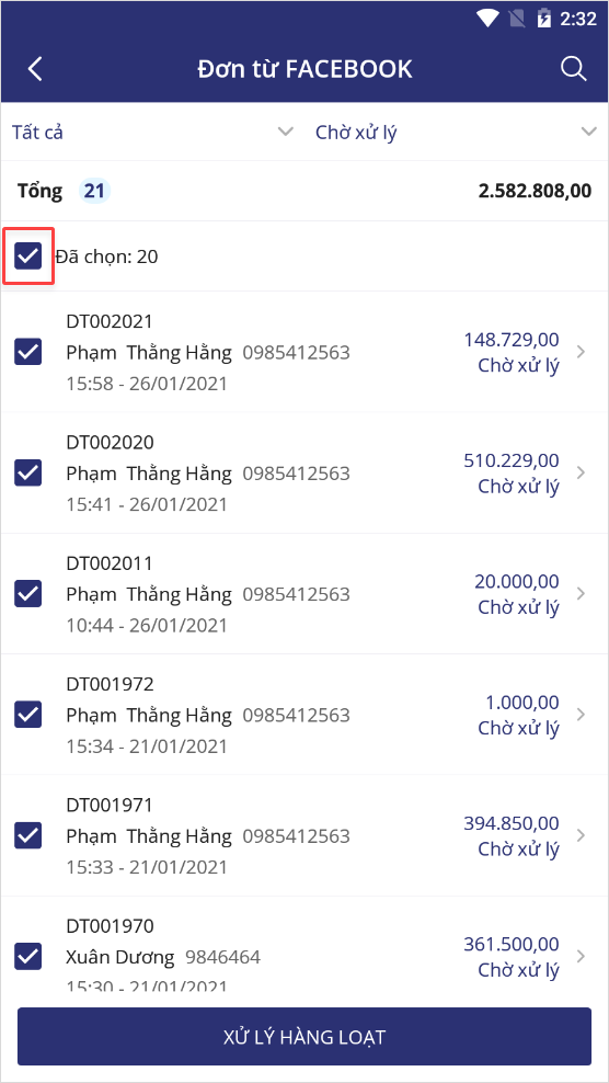 Tích chọn Tất cả đơn hàng, nhấn Xử lý hàng loạt.