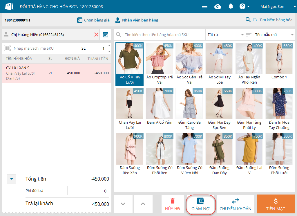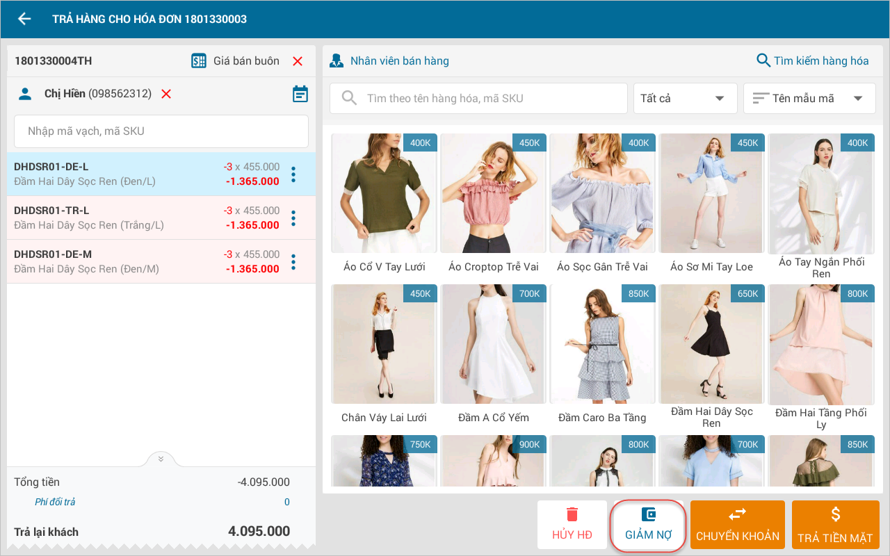 • Tại màn hình Đổi trả hàng, sau khi ghi nhận hàng hóa khách trả lại, nhấn Giảm nợ.