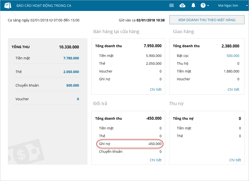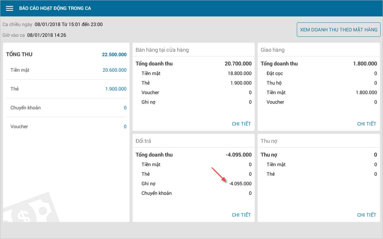 • Số tiền Giảm nợ sẽ được ghi nhận vào thông tin Ghi nợ trên Báo cáo hoạt động trong ca.
