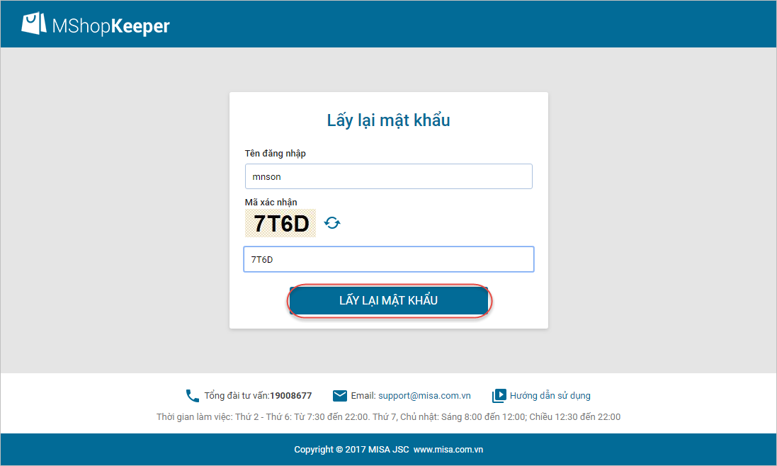 • Sử dụng chức năng Quên mật khẩu: Nhập tên đăng nhập, Mã xác nhận, nhấn Lấy lại mật khẩu.