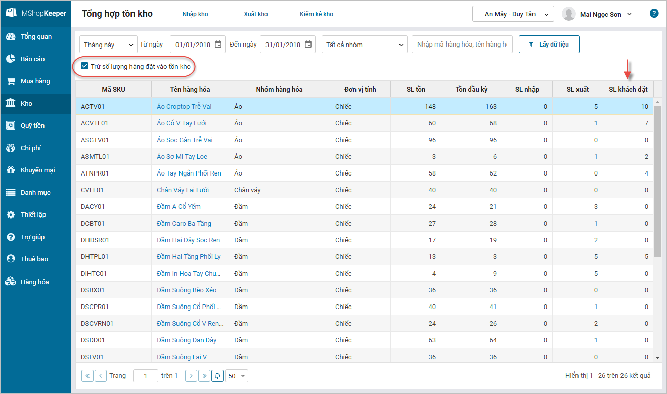 • Khi xemTổng hợp tồn kho, tích chọn Trừ số lượng hàng đặt vào tồn kho.