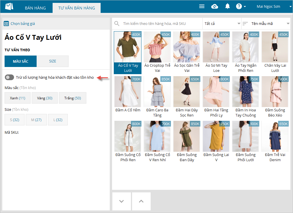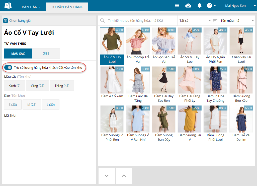 • Tại màn hình Tư vấn bán hàng, chương trình bổ sung tính năng Trừ số lượng hàng đặt vào tồn kho. Khi tích chọn, chương trình cũng sẽ tính lại số lượng hàng tồn kho trừ đi số lượng hàng khách đã đặt trước.