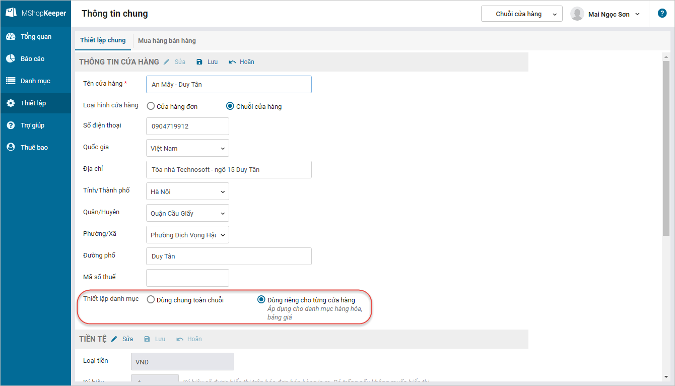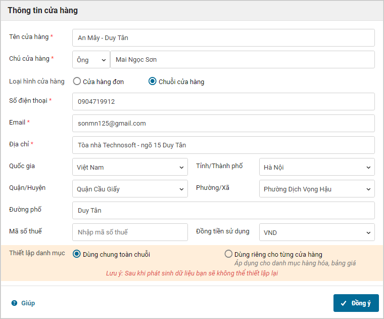 • Khi thiết lập thông tin cửa hàng, quản lý lựa chọn Thiết lập danh mục dùng chung cho chuỗi hoặc dùng riêng từng cửa hàng.