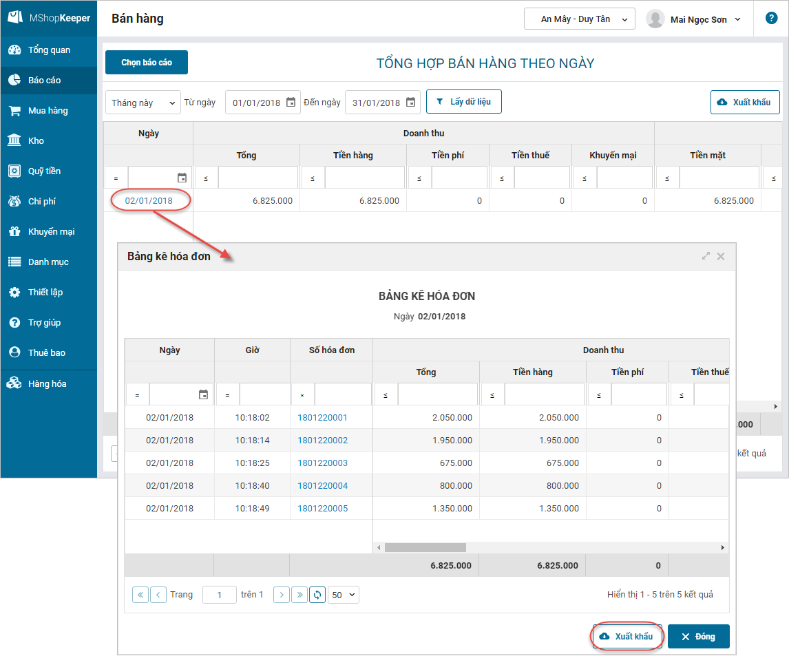 Ví dụ: Quản lý có thể xuất khẩu trực tiếp báo cáo Bảng kê hóa đơn khi xem từ báo cáo Tổng hợp bán hàng theo ngày.