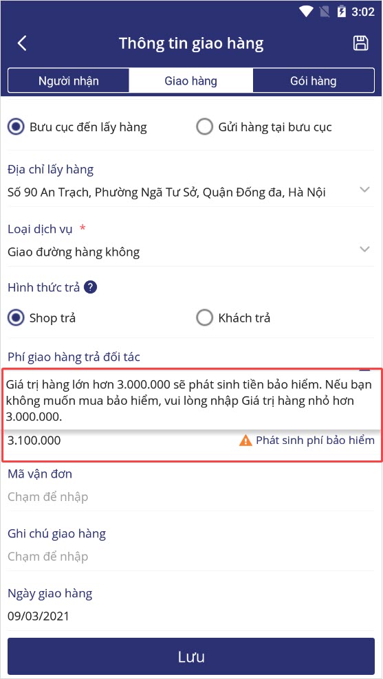 Khi tạo đơn hàng, nếu cửa hàng nhập giá trị đơn hàng trên 3.000.000đ, chương trình sẽ hiển thị thông báo đơn hàng phát sinh tiền phí bảo hiểm. Nếu cửa hàng không muốn mua bảo hiểm, vui lòng nhập giá trị đơn hàng dưới 3.000.000đ.