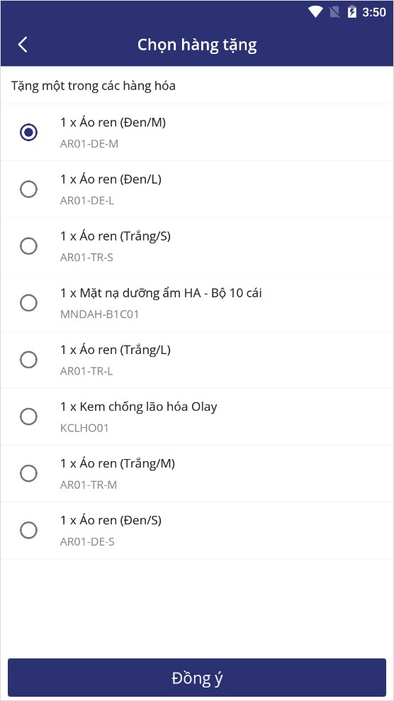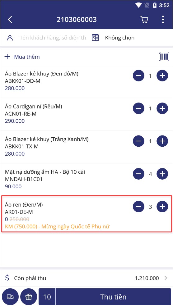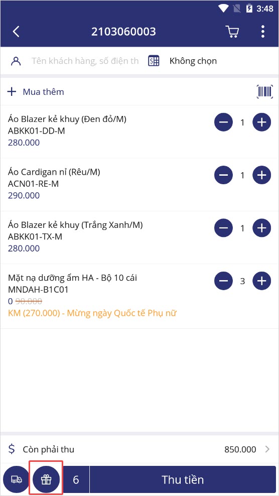 5. Trên hệ điều hành Android, Thu ngân có thể áp dụng các chương trình khuyến mại Mua m tặng n được tạo từ trang quản lý.