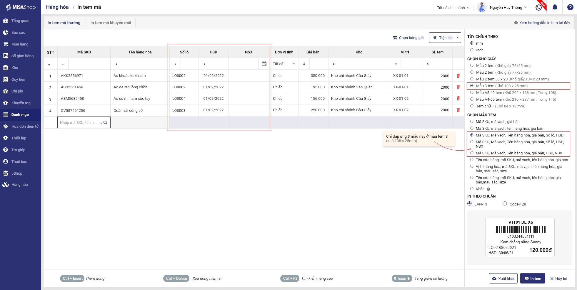 Bước 2: Chọn hàng hóa cần in tem, chương trình hiển thị cột Số lô, HSD, NSX tương ứng với từng hàng hóa.